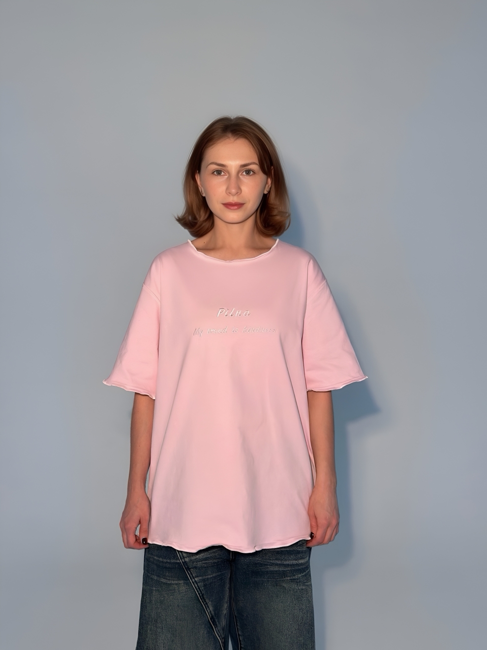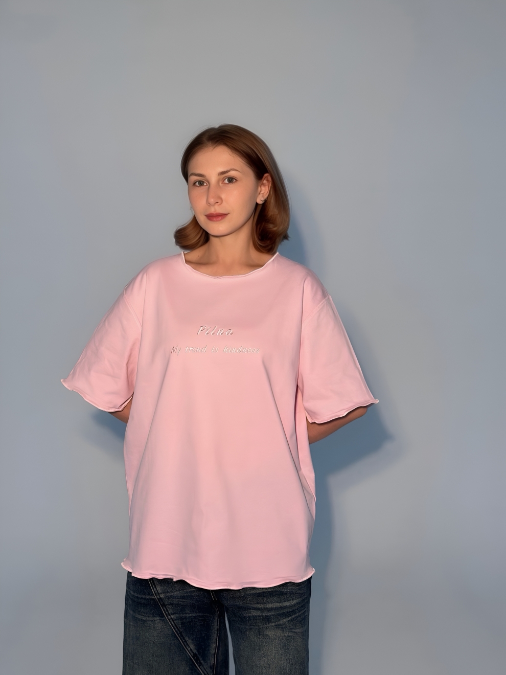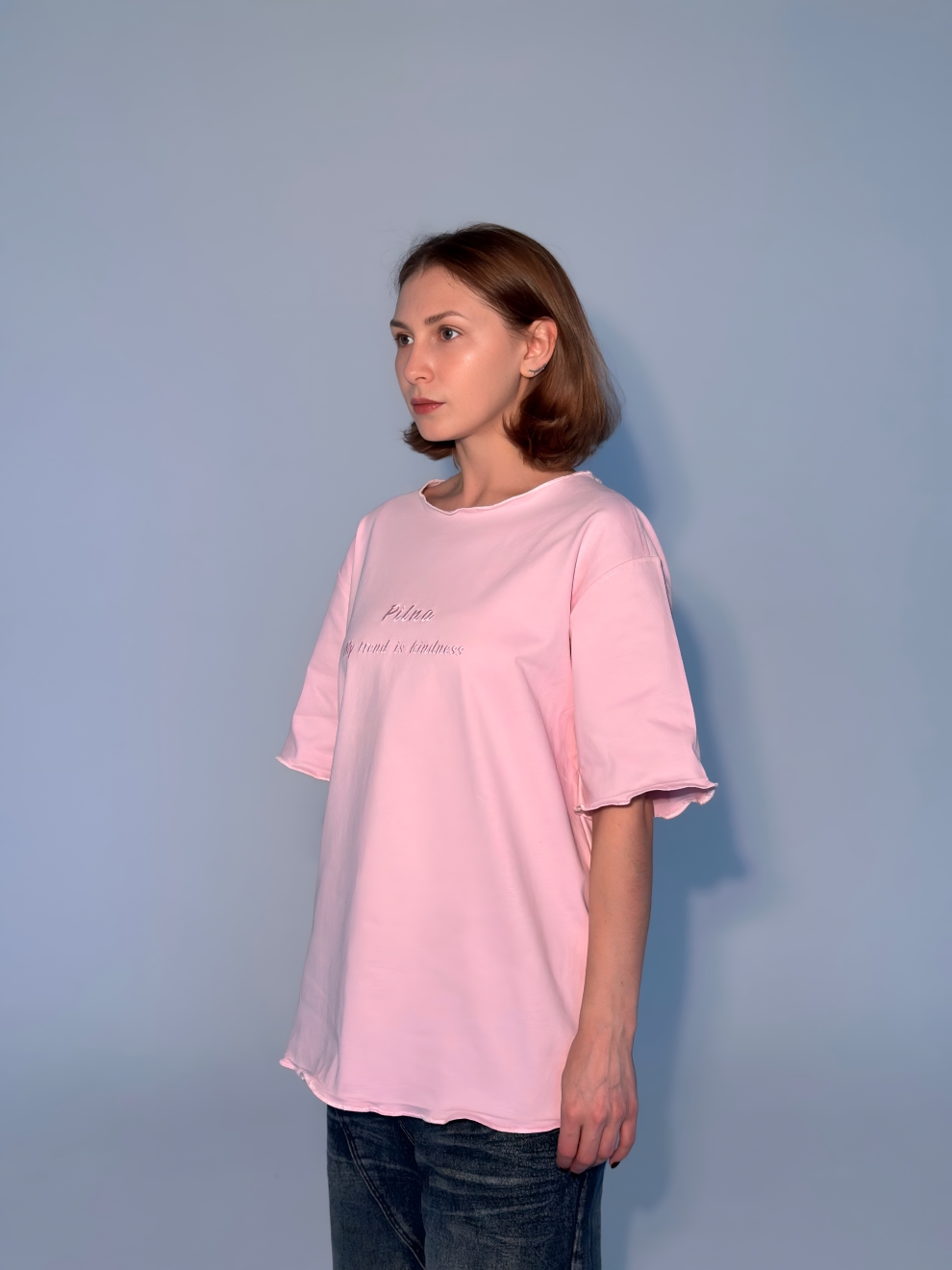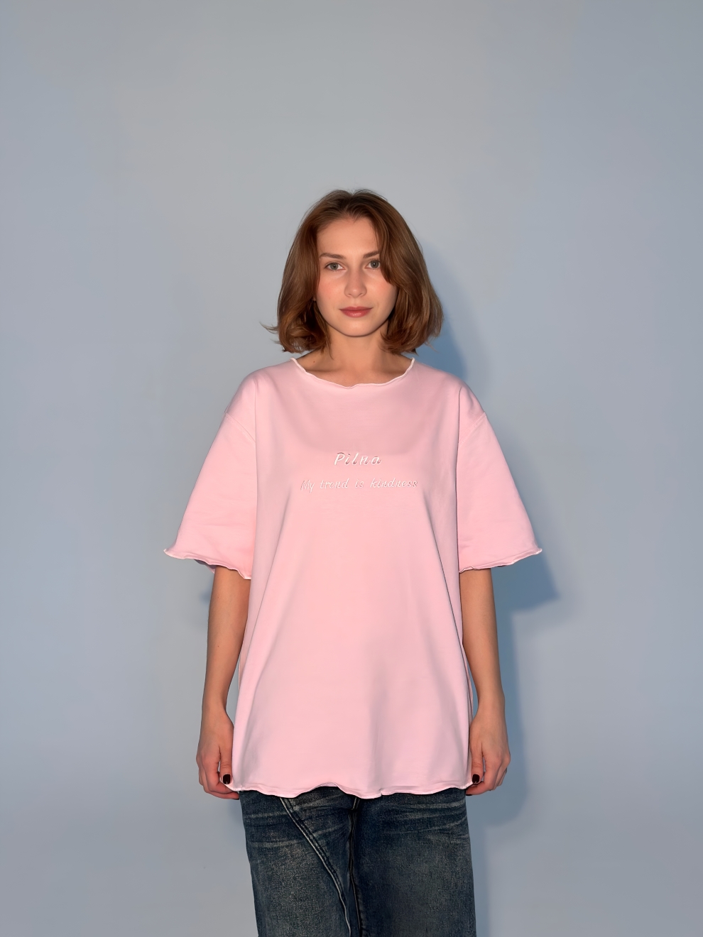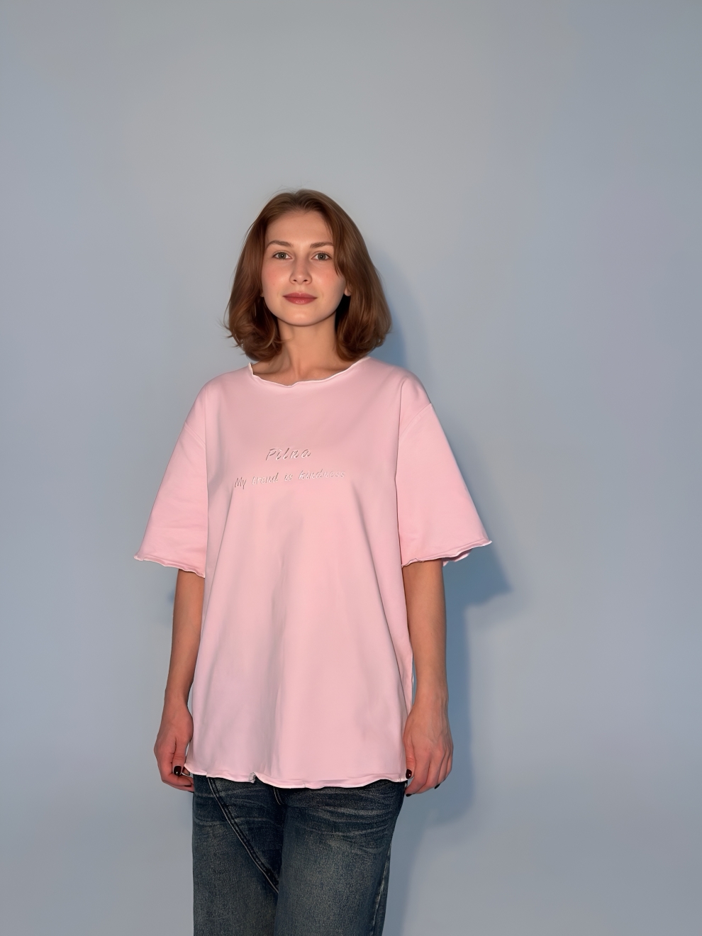 Футболка выполнена из плотного 100% хлопка, спереди вышивка «My trend is kindness” (Мой тренд доброта)