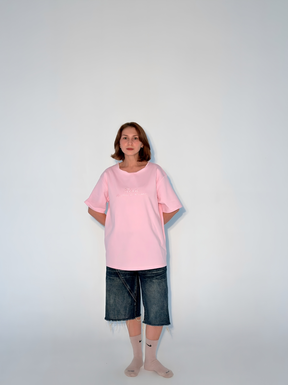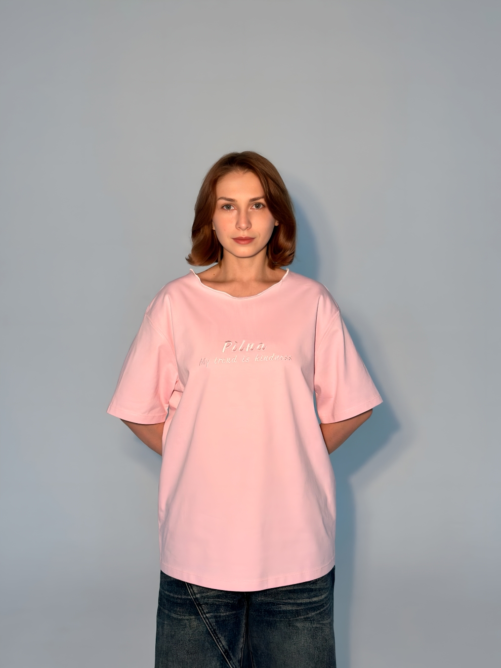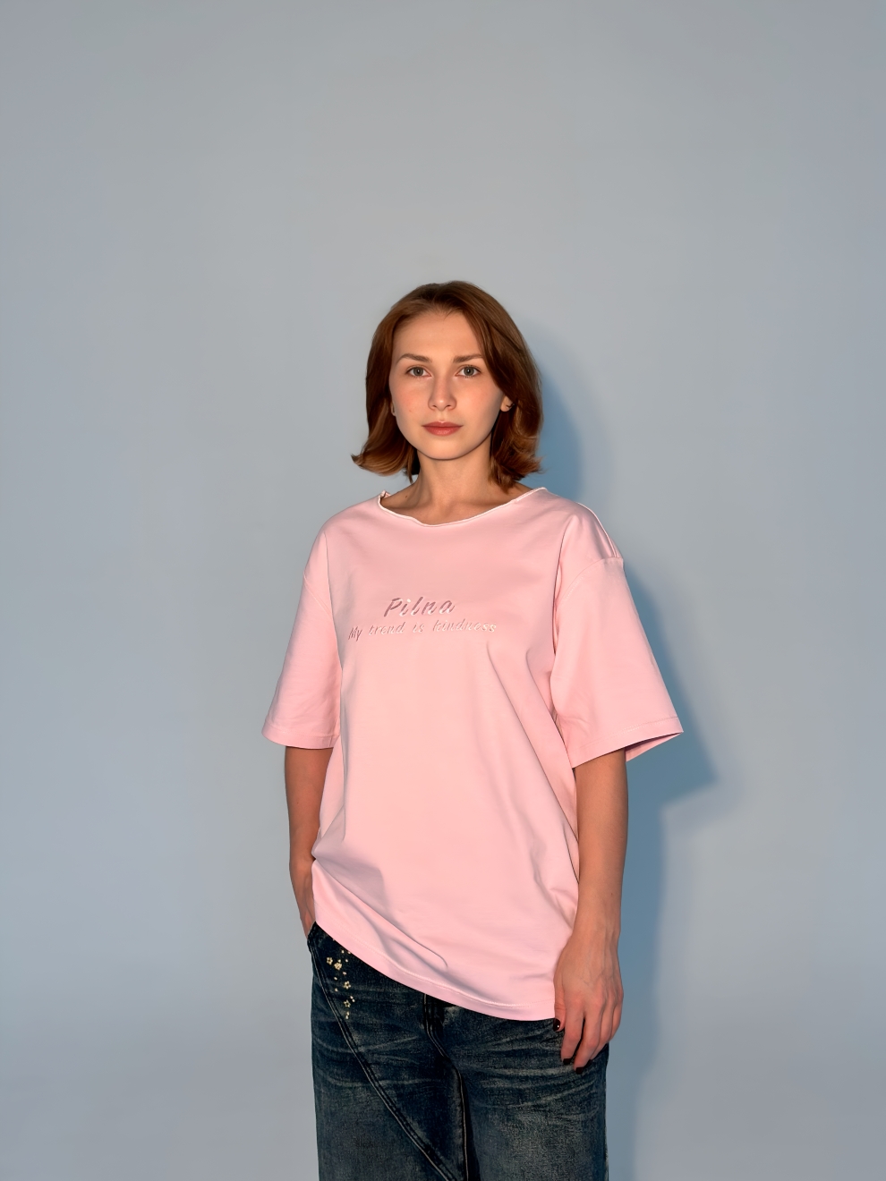 Футболка выполнена из плотного 100% хлопка, спереди вышивка «My trend is kindness” (Мой тренд доброта)
