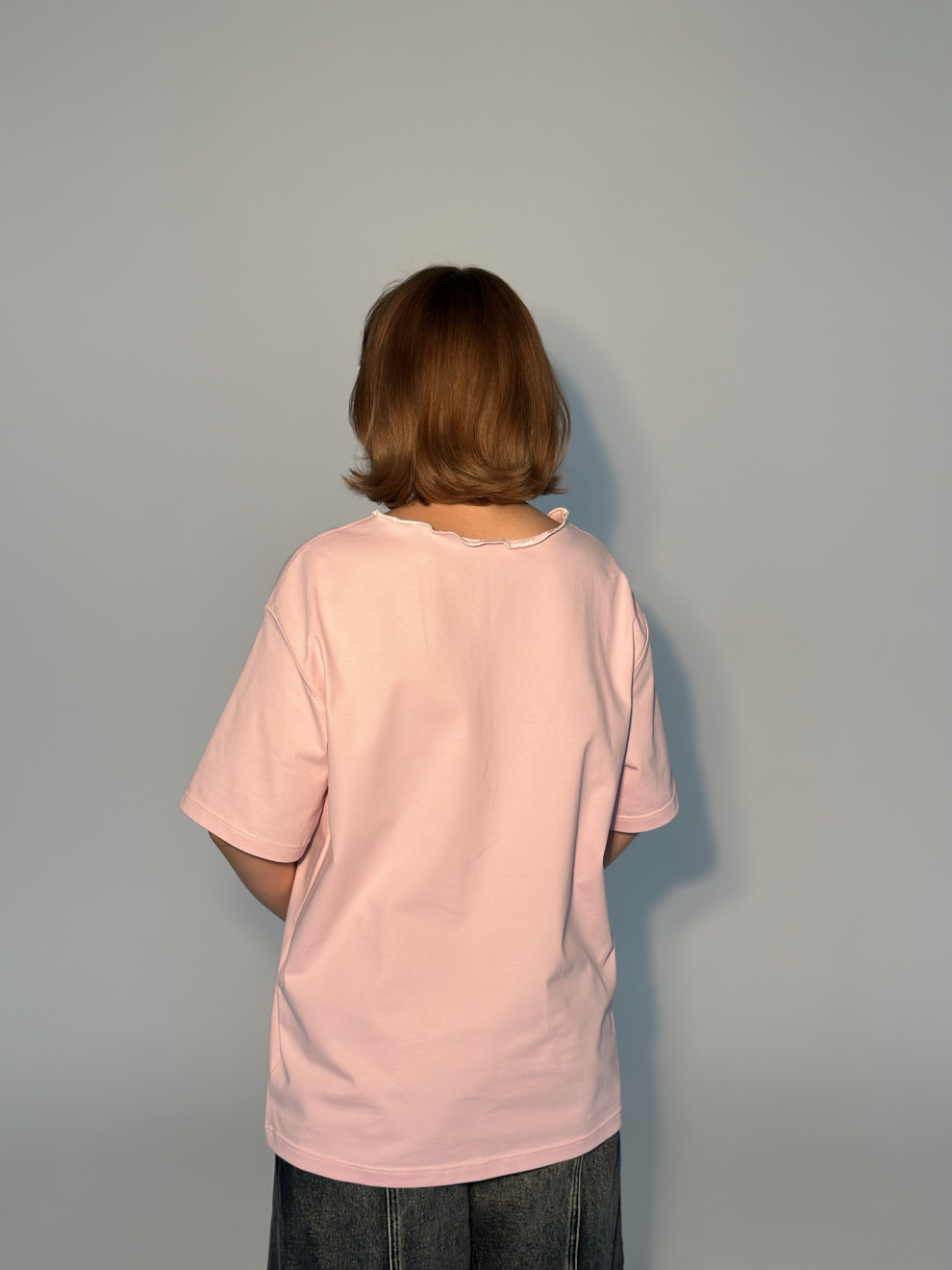 Край ворота футболки обработан особым способом, что делает его волнистым. Расширенная горловина красиво подчеркивает шею и ключицы.