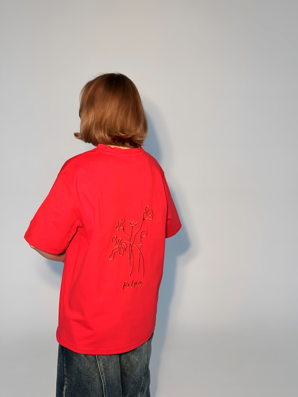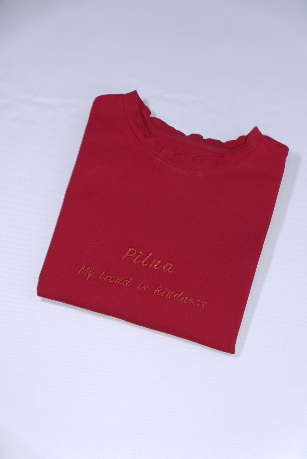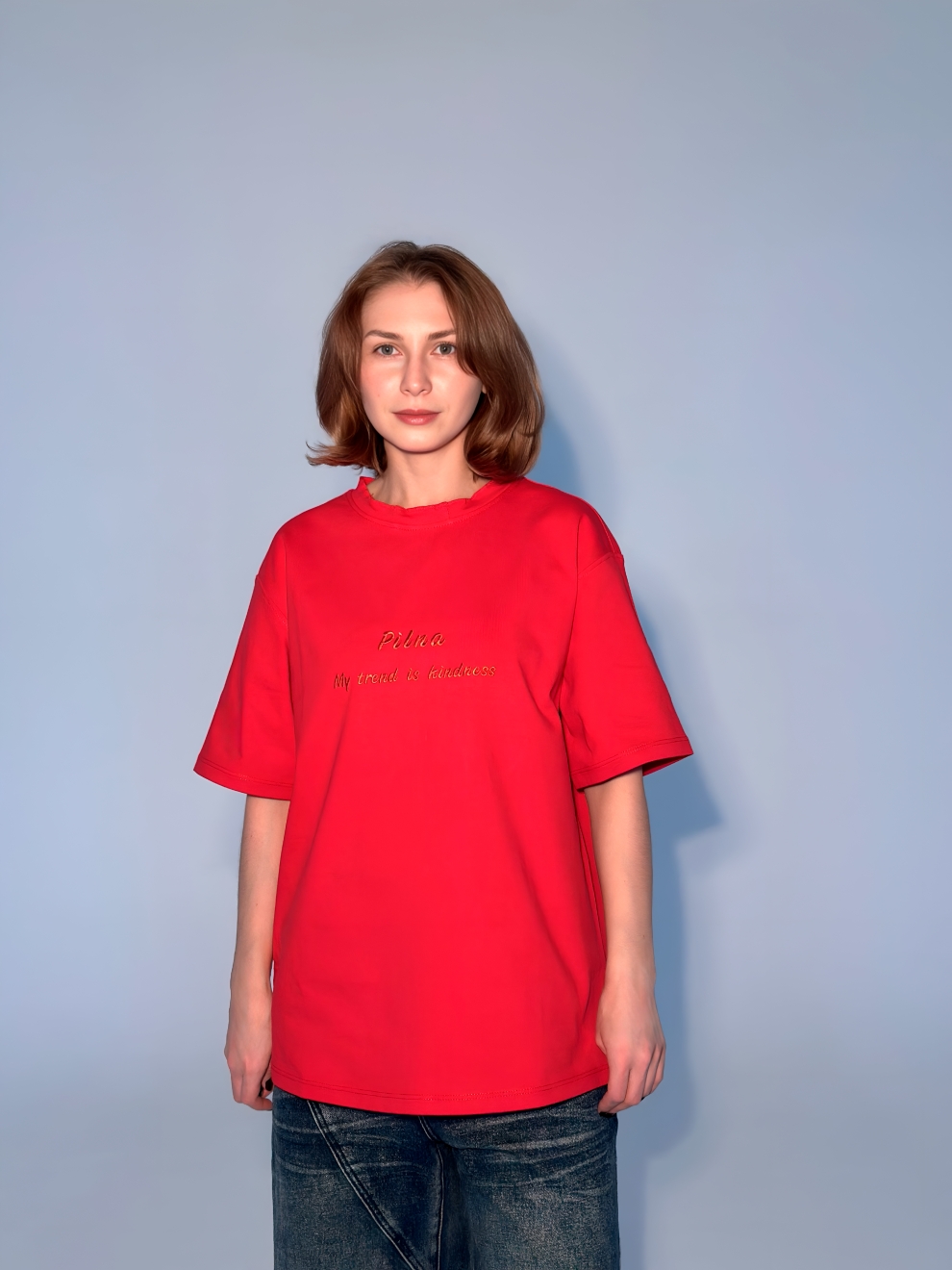 Футболка выполнена из плотного 100% хлопка, спереди вышивка «My trend is kindness” (Мой тренд доброта)