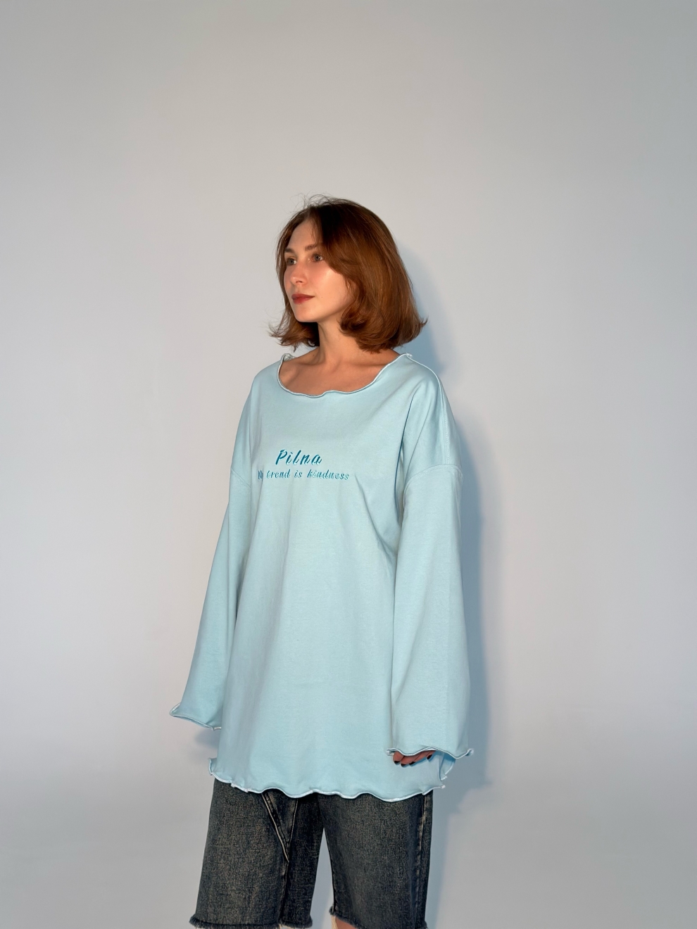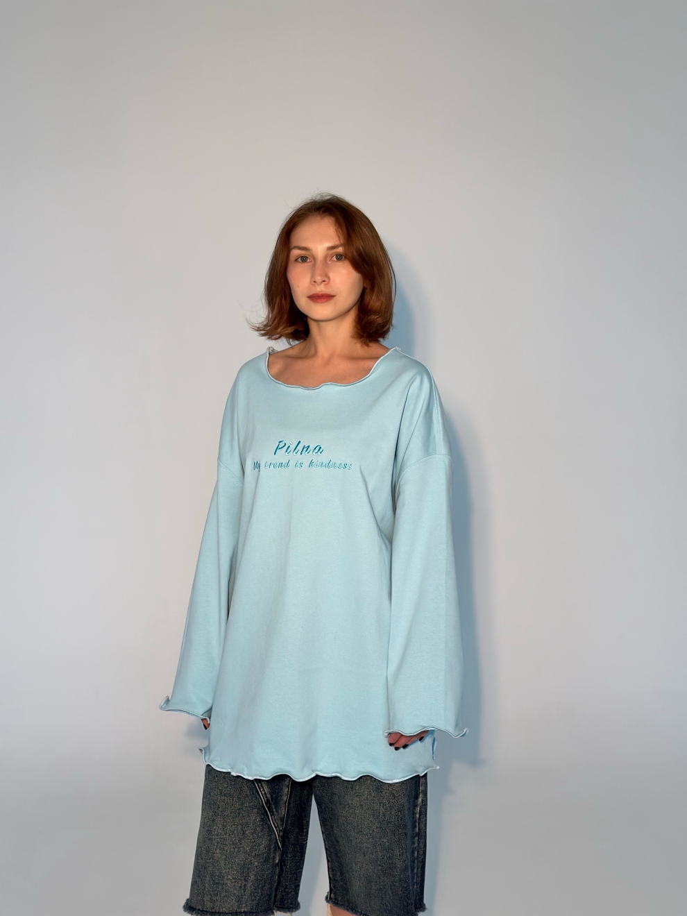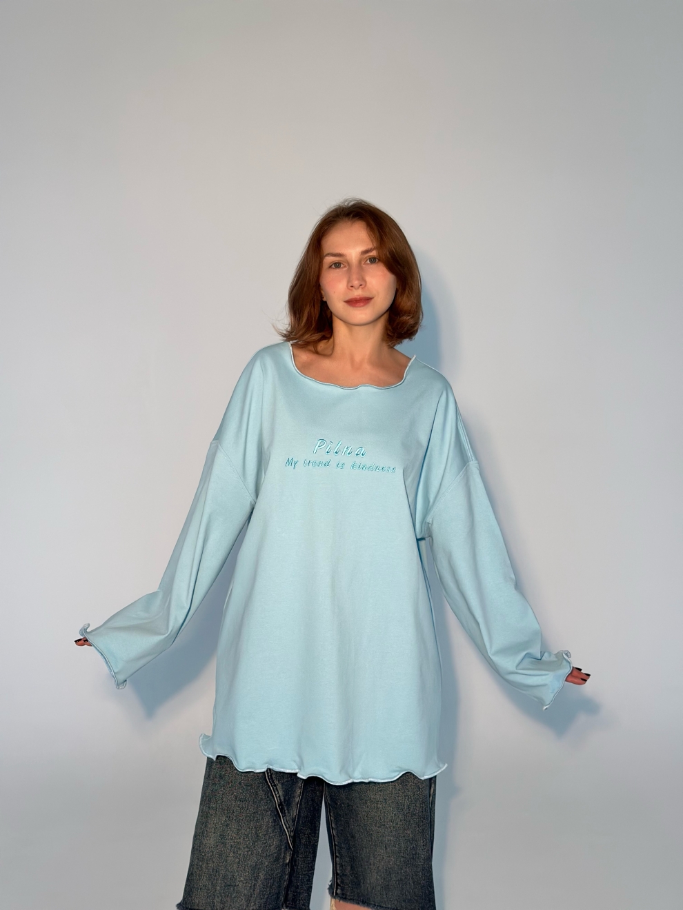 Лонгслив выполнен из плотного 100% хлопка, спереди вышивка «My trend is kindness” (Мой тренд доброта) + вышивка на спинке.